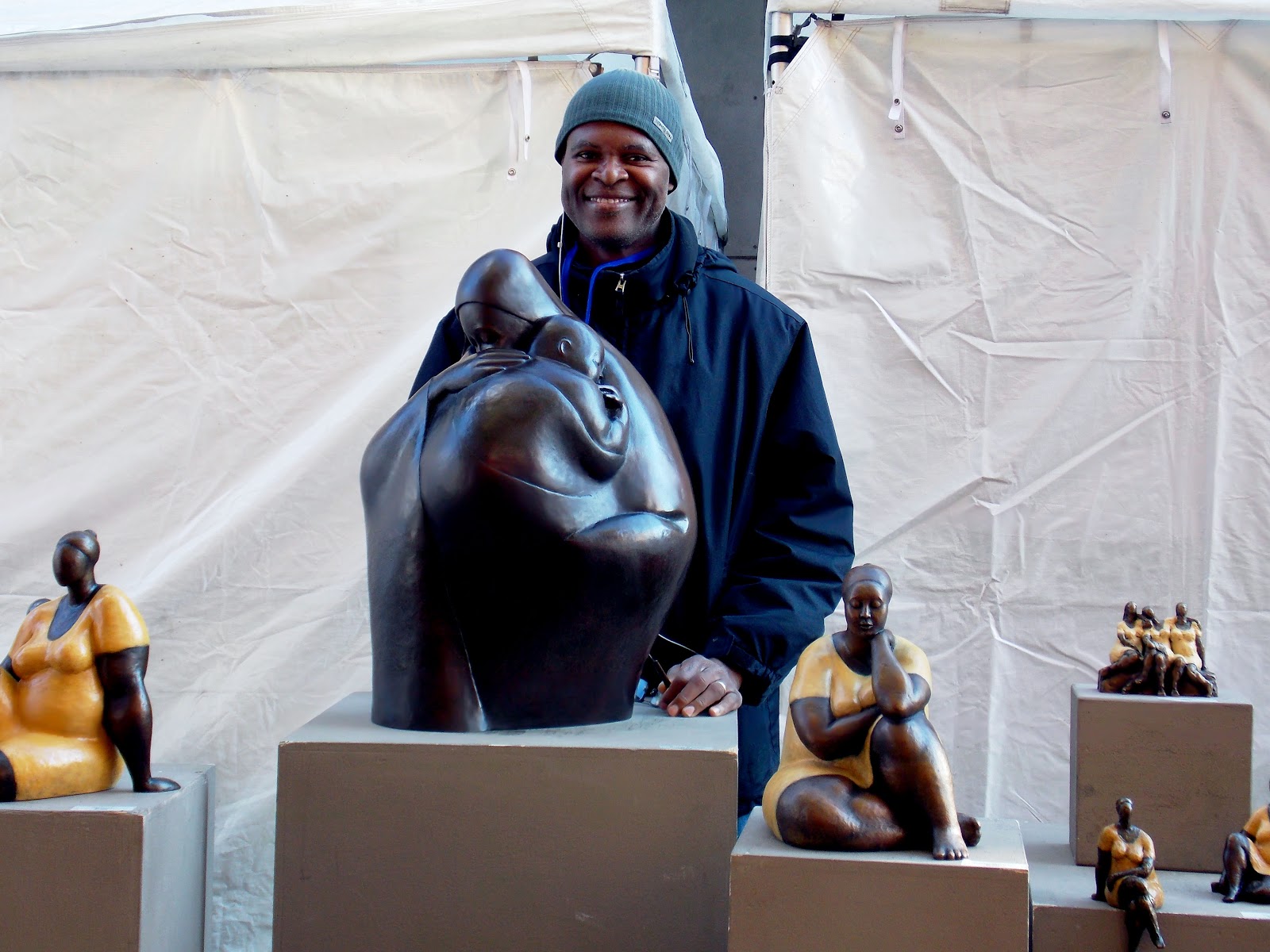 | Nnamdi Okonkwo, a sculptor from Fayetteville, GA stands with some of his sculptures which are up for sale. |